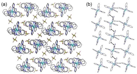 Crystal packing of 1b: a top view of chains of [Fe(tpma)(bimz)]2+ cations (a) and a side view of one chain (b). The π-π and σ-π contacts within the chain are indicated with black and gray arrows, respectively. Color scheme: Fe = cyan, F = green, O = red, N = blue, C = gray, B = coral. Hydrogen atoms are omitted for clarity.