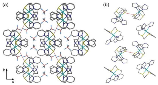 In recent years, our and other groups have reported SCO in several Fe(II) complexes with the {N4S2} coordination, in which the S-donor atoms are provided by thioether functionalities [3,4,5,6,7,8,9,10,11]. In general, one thinks of thioethers as rather weak ligands, and initially we were quite surprised by the observation of SCO in such coordination environment. Nevertheless, the use of Mössbauer spectroscopy unequivocally confirmed the conversion between the LS and HS states of the Fe(II) ion in these complexes [5]. Another interesting aspect of such complexes is the large change in the Fe–S bond length (~0.3 Å) that takes place upon conversion between the LS and HS structures, due to population of the antibonding eg-orbitals in the HS state. In comparison, the typical change in the Fe–N bond lengths is ~0.2 Å [12,13]. Thus, the SCO in the complexes with the {N4S2} coordination may also result in larger structural changes propagated through the crystalline lattice. These findings and considerations suggest new possibilities in the synthesis of SCO materials and their spin-state switching behavior.