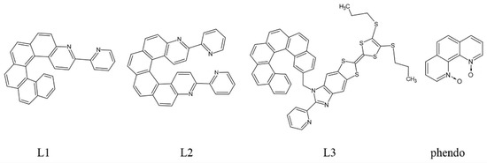 Helicenes used as ligands in the lanthanide-based complexes reported to date: L1 = 3-(2-pyridyl)-4-aza[6]helicene [64], L2 = 3,14-di-(2-pyridyl)-4,13-diaza[6]helicene [65], L3 = 2-{1-[2-methyl[6]helicene]-4,5-[4,5-bis(propylthio)tetrathiafulvalenyl]-1H-benzimidazol-2-yl}pyridine [66] and phendo = 1,10-phenanthroline-N,N’-dioxide [67].
