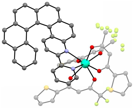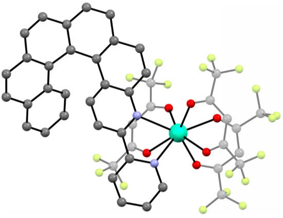 Lanthanide complexes with helicenes are also interesting from the point of view of luminescence. Lanthanides have very sharp emission lines and usually long lifetimes of the exited states with a variety of available emission energies from visible to near IR. Due to the fact that f-f electronic transitions are forbidden (Laporte rule) [38], various ligands are used in lanthanide complexes as antennae for their indirect sensitization [39,40,41,42,43]. Helicenes can also act as antennas, as they consist of conjugated aromatic rings similarly to many ligands with a similar use. Lanthanide complexes with helicenes may also give access to circularly polarized luminescence (CPL), which is much more widely studied for purely organic compounds and transition metal complexes [44,45,46,47,48].