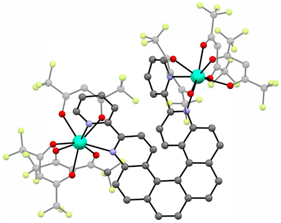 In 2018, the next two lanthanide–helicene complexes were reported [65]. These two complexes are based on a very similar 2,2′-bipyridyl derivative, but this time it has two 2,2′-bpy fragments, so it can serve as a molecular bridge between two lanthanide ions. Two isostructural compounds are reported: [Dy2(hfac)6(L2)] (3) and [Yb2(hfac)6(L2)]∙C6H14 (4) (L2 = 3,14-di-(2-pyridyl)-4,13-diaza[6]helicene) (Figure 4). Only racemic forms of 3 and 4 were obtained and studied. The local geometry of the dinuclear molecules 3 and 4 are very similar, but they differ in the crystal packing due to the presence or absence of the different types of crystallization solvent molecules. Both dimers crystallize in the triclinic P space group. In both dimers every metal center has a slightly different symmetry (two crystallographically independent DyIII or YbIII centers). Helicene angle in the dysprosium dimer 3 is 55.3(1)° while in ytterbium dimer 4 it is 61.0(1)°. Ln⋅⋅⋅Ln distance in 3 and 4 is 9.320 Å and 9.890 Å, respectively. Both complexes are field-induced SMMs. Similarly to 1 and 2, compounds 3 and 4 also show co-existence of the helicene- and lanthanide-specific functionalities, rather than the coupling of the two.