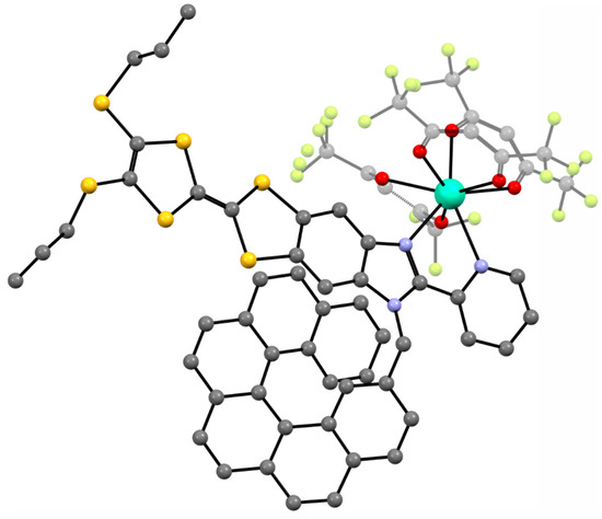 In 2019, another Dy(III) complex with a more sophisticated helicenic ligand was reported by Pointillart et al. [66]. The authors successfully combined the chiral carbo[6]helicene backbone with the electroactive tetrathiafulavalene (TTF) core (L3 in Figure 1). The resulting compound [Dy(hfac)3(L3)]·0.5CH2Cl2 (9) (Figure 5) is a chiral redox-active SMM. Only the racemic form of this complex was studied; 9 crystallizes in a triclinic space group P. The coordination sphere of Dy(III) N2O6 is very similar to the other complexes, 1–8. The two nitrogen and six oxygen atoms form a quasi-D2d polyhedron around the Dy(III) center. The shortest Dy⋅⋅⋅Dy distance is 9.529 Å. The [Dy(hfac)3(L3)] molecules are stacked along the a crystallographic axis thanks to the intramolecular π-π interactions between the helicene backbones of one molecule and the (1H-benzimidazol-2-yl)pyridine (bzip) fragment of the neighboring one in a “head-to-tail” fashion.