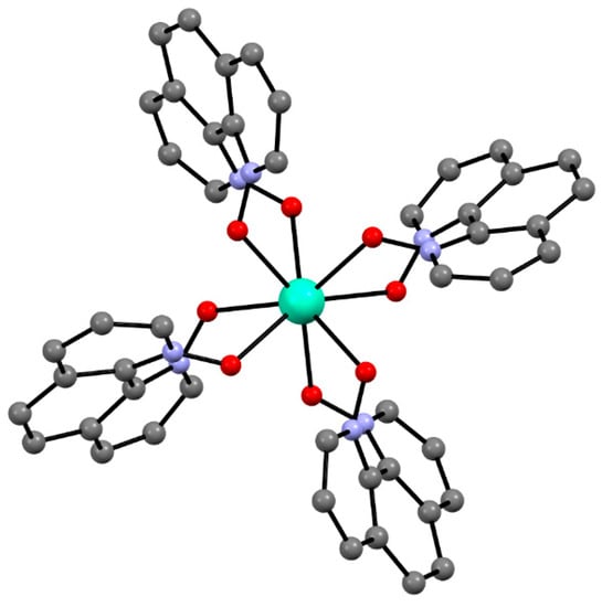 The crystal structure of the [Gd(phendo)4]3+ cation in compound 10 as the representative example of the isostructural series [Ln(phendo)4](NO3)3·xMeOH (Ln = Er for 11, Yb for 12). Gd—teal, O—red, C—gray, N—blue.