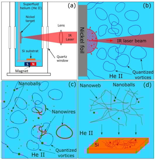 (a) Cryostat equipped with laser focusing system, quartz window, Ni target, permanent magnet and Si substrate covered with TEM grid; (b) Laser induced evaporation of the Ni accompanied by creation of quantum vortices in He II; (c) Ni atoms and clusters captured by vortices; (d) Elongated nanowire segments cross and result in net, containing nanoballs. All products attracted by permanent magnet are deposited on the Si substrate.