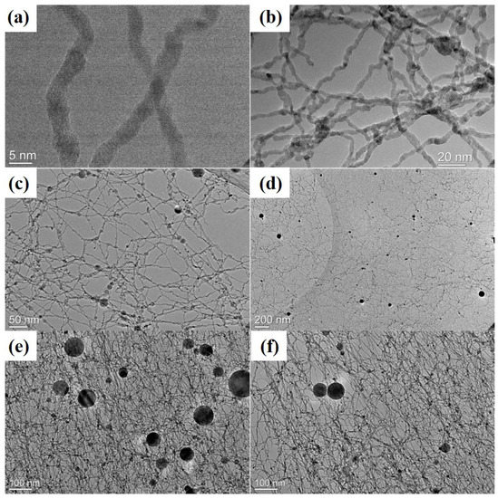 TEM images of the network at different stages of ablation: (a,b) Early stage (10 min), (c,d) intermediate stage (30 min), (e,f) later stage (60 min).