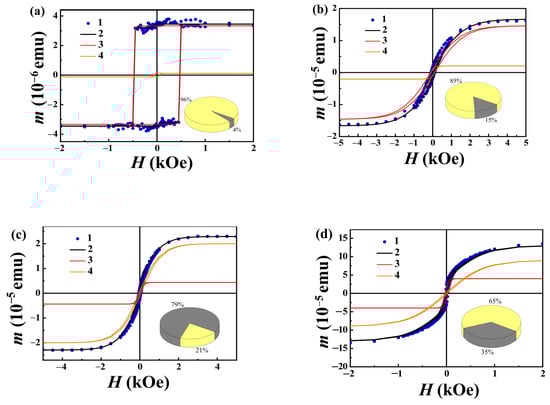 Magnetic hysteresis at 300 K: (a) in the sample with low Ni concentration (after short (10 min) laser exposure), (b) lower-intermediate Ni concentration (after 20 min laser exposure); (c) upper-intermediate concentration (30 min laser exposure); (d) high Ni concentration after laser ablation for 1 h. Symbols are experimental data, and solid lines are approximation by the two-hysteresis model described in the text. Separate magnetic contributions of the nanowires and nanoballs are shown by thin red solid lines. Relative volume concentrations of the nanowires (yellow) and nanoballs (grey) are shown in the circle diagrams in the bottom insets to the correspondent hysteresis.