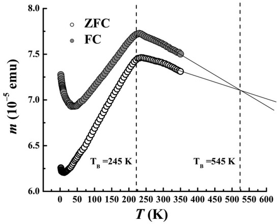 This formula allows one to estimate the blocking temperatures TB by substituting effective anisotropy constant Keff and particle volume V into Equation (3). If we substitute the shape anisotropy of nanoballs that decreased due to form factor KA = 2/3πMs = 0.74 · 105 erg/cm3 instead of Keff, and Vball ≈ 4.2 · 10−18 nm3 corresponding to the average diameter of the balls of 5 nm at the later stage of ablation (see histogram in Figure 3f) into Equation (3), we can obtain TB = 548 K. This value coincides well with that found by the extrapolation of the FC and ZFC dependences to their intersection (Figure 6). According to the Neel–Brown theory, in the system of non-interacting separated nanoparticles, the temperature corresponding to the maximum of the M(T) curve is exactly equal to the blocking temperature Tb [30]. The crossing point of the FC and ZFC curves is very close to the blocking temperature, and we assume an approximate equality of these temperatures Tc ≈ Tb neglecting the interparticle interaction.