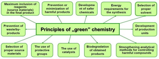 - maximum increase of components—“atom economy” (design of synthesis to maximize raw materials ratio in the final product with the least or no amount of waste);
