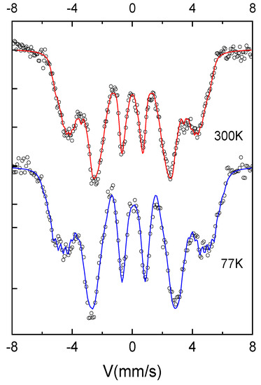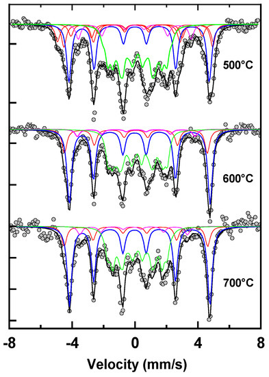 Hyperfine parameters as resulted from fitting of the Mössbauer spectra (Figure 6).