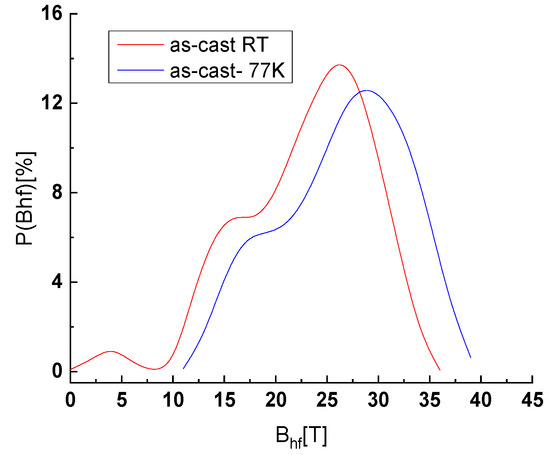 300K and 77K Mössbauer HF distribution of as-cast Fe65Pt15Zr3B17 sample.