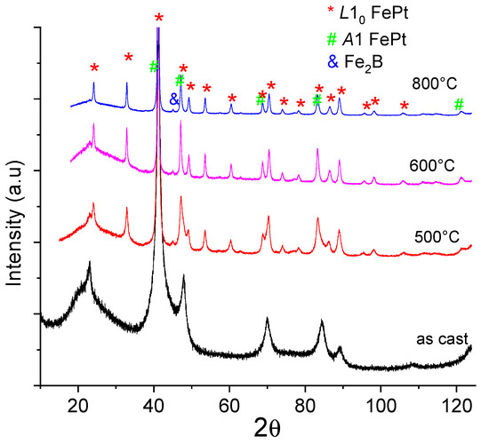 The structure of the resulting samples was characterized by XRD, Mössbauer spectrometry and their magnetic properties by vibrating sample magnetometry and SQUID. The X-ray diagrams of the annealed samples are plotted in Figure 4. For a better comparison, the as-cast X-ray diffractogram is also added. In the as-cast state, the broad Bragg peaks of the disordered A1 FePt-rich solid solution have been identified, as previously discussed. The broad line centered at around 25° is due to the sample holder and it can be seen that this broad feature is preserved at all annealing temperatures, until 800 °C, where the intensity of the main Bragg peak is very high and the broad feature appears strongly diminished due to scaling. At 500 °C, the A1 fcc pattern is better formed, with a smaller linewidth than in the as-cast state. Besides these lines, the main superlattice peaks of the tetragonal L10 phase appear already formed. At 600 °C the main superlattice peaks of the tetragonal L10 phase are more pronounced and the process of peak narrowing is furthermore continued, as expected. Starting with 600 °C a small Bragg peak, attributed to the main Bragg reflection of the Fe2B tetragonal phase, is observed.