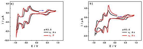 CVs of (a) α1-As (black) and α1-P (red); (b) α1-As (black) and α2-As (red) in 0.2 M Na2SO4 + H2SO4/pH3. Working electrode: GC; counter electrode: Pt; reference electrode: SCE. Scan rate: 10 mV s−1.