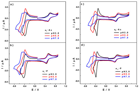 The four compounds, α1-K8[As2W17V4+O62].18H2O (α1-As), α2-K8[As2W17V4+O62] 18H2O (α2-As), α1-K8[P2W17V4+O62] 18H2O (α1-P), and α2-K8[P2W17V4+O62] 18H2O (α2-P), were first characterised in the 0.2 M Na2SO4 + H2SO4/pH3 medium, used as a reference pH. These first results were in line with our expectations and the results of the scientific literature [41,49,50]. Indeed, in the cyclic voltammograms (CVs) in Figure 2a below and Figure S1a in the SI, we observed that the CVs of the phosphorus-containing species were slightly shifted to the left (towards the negative potentials) compared to the CVs of the arsenic-containing species. The W(VI) centres of the α1-As and α2-As species were more easily reduced than those of their phosphorus-containing counterparts (α1-P and α2-P). This difference in the reduction peak potential, ΔEc, between the different tungsten waves varied between 38 and 64 mV for the α1-As and between 34 and 72 mV for the α2-As (see Table 1). Indeed, previous studies have shown that Dawson-type POMs containing As as a hetero-element were easier to reduce than their P-containing counterparts [46,47]. This outcome, which has also been observed and studied in the case of Keggin-type POMs, was the consequence of differences in the atomic radius of the heteroatoms and in their electronegativities [51,52].