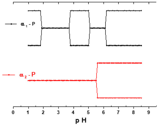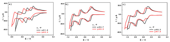 In order to be able to study all these phenomena, which seemed to be the consequence of the variation of the concentration of protons in the medium, and to eliminate any disturbance that would come from the nature of the electrolyte, we then chose to work with an electrolyte solution that had a buffering capacity in a wide pH window, the Britton–Robinson buffer (S3). For this study, only the phosphorus-based compounds, α1-P and α2-P, were analysed in a pH range of 1.0 to 8.0, a range in which these vanadic POMs have been shown to be stable [44]. A comparative study between the As- and the P-containing compounds did not appear to be of any interest, as the only difference observed between the two families of compounds was the potential shift mentioned above.