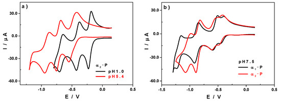 (a) CVs of α2-P in Britton–Robinson buffer at pH 1.0 (black) and pH 5.4 (red); (b) CVs of α1-P (black) and α2-P (red) in Britton–Robinson buffer at pH 7.5. Working electrode: GC; counter electrode: Pt; reference electrode: SCE. Scan rate: 100 mV s−1.