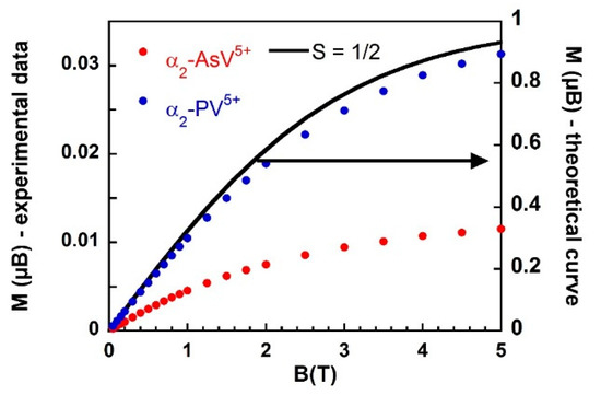 Nevertheless, to exclude other possibilities of such behaviour (antiferromagnetic coupling for the As-containing POMs or ferromagnetic coupling for the P-containing POMs), magnetization M vs. field B measurements were carried out at low temperatures (6, 4, and 2 K). The results are depicted in Figure 12. These curves, in the form of M vs. B/T plots, could be simulated with a Brillouin function [55] for a S = 1/2 ion, thus showing that the V4+ ions were isolated, and that the decrease or the increase observed in χmT in the range 20–250 K was not the result of a magnetic coupling.