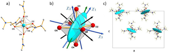 The compound (1) crystallizes in the orthorhombic space group Pca21 with four molecules per unit cell [42]. The Co(II) ion lies in a slightly distorted octahedral environment of six oxygen atoms and the overall symmetry of the [Co(DMF)6]2+ cation is approximated as a S6 point group [42]. The coordination octahedron is compressed along the O2-O3 and O5-O6 directions and is rather elongated along the perpendicular directions O2-O6 and O3-O5 (Figure 4a).