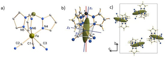 The iron(III) compound, PPh4[FeIII(Tp)(CN)3]·H2O (2), crystallizes in the monoclinic space group P21/c [43]. The Fe(III) ion is coordinated in an octahedral environment by three carbon atoms of cyanide ligands in facial arrangement and three nitrogen atoms of tridentate trispyrazolylborate. The symmetry is close to C3v and the octahedron is slightly elongated along the C3 pseudo-axis going through the iron and boron atoms (Figure 5a).