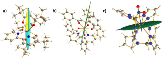 The diagonalization of this two-rank tensor provides the eigenvectors and eigenvalues of the magnetic principal directions i.e., the directions of the magnetic axes and the associated magnetic susceptibilities (χ1, χ2 and χ3). When they are all positive, it is then possible to make a graphical representation of the site susceptibility tensor as an ellipsoid onto the molecular structure (Figure 3). This drawing, from the six components susceptibility tensor (χij), is similar to what is currently done with crystallographic thermal parameters (Uij). As we will see, this allows the visualization of the direction of the principal magnetic axes onto the molecule whether the anisotropy is of easy-axis (Ising) or easy-plane type. This is a way to easily evidence magneto-structural relationships (Figure 3).