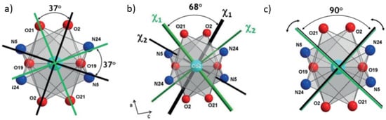We can see that for both Co, two magnetic principal directions have negative susceptibility values (Table 1). This prohibits the drawing of a magnetic ellipsoid. Thus, only the directions of the eigenvectors can be represented (Figure 8a). However, this is enough to show that the b axis is a common magnetic principal direction for both Co ions. They are denoted as χ3 and their weak susceptibility values mean that the local magnetic moments are mainly constrained in the (a,c) plane. In this plane, we find the local easy magnetization axis, denoted as χ1 and χ2, which have similar susceptibility values of the order of 0.68 and of the order of −0.20 , respectively, for both Co ions.