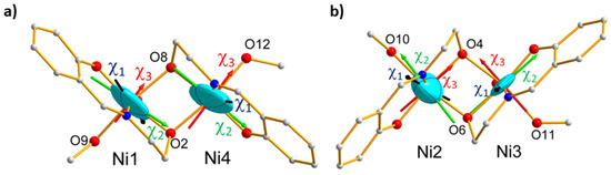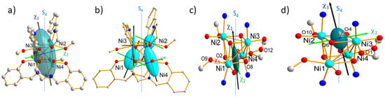 The obtained values reported in Table 2 indicate that the tensor associated to the Ni1-Ni4 pair is more anisotropic than the tensor relative to the Ni2–Ni3 pair. The magnetic ellipsoids and principal magnetic axes are represented in Figure 9c,d. The easy axes () of the pairs are both close to the S4 pseudo-symmetry axis, but the hard () and intermediate ( axes are found nearly perpendicular to each other axes, as well. This is in agreement with local geometries as octahedrons around Ni1 and Ni4 than for Ni2 and Ni3. In contrast, the elongation directions of the AF pairs are orthogonal to each other. However, the local tetragonal distortion is slightly larger for (Ni2, Ni3) than for (Ni1, Ni4). This suggests that the axial distortion of the coordination octahedron is not the only source of magnetic anisotropy but the deformation of the triangular faces of the octahedron. This in turn means that deformation in the equatorial directions of the coordination octahedron plays an important role. The effective magnetic tensors associated to each antiferromagnetic pair (Figure 9) reflect the resultant of the effective single ion tensors of the Ni ions involved in the pair (Figure 10). Noticeably, the hard magnetic axes of the both pairs are perpendicular to each other, in agreement with the local directions of tetragonal distortion.
