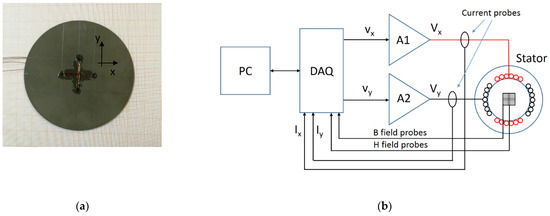 The two perpendicular windings of the stator are fed by two programmable linear 4-quadrant power amplifiers with frequency band DC—20 kHz and nominal voltage gain Av = 5. A data acquisition board (DAQ), working in generation/acquisition mode was programmed in Matlab® to generate the input signals of the amplifiers and simultaneously detect the signals for the evaluation of H and B and for the control of the measurement system.
