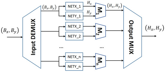 An input de-multiplexer assigns the magnetic induction vector (Bx, By) to the input of both feedforward neural networks pertaining to the proper circular crown. The components of the magnetic field, computed by the couple of NNs, are collected by the multiplexer Mj and finally sent to the output. The vector model was inspired by the one proposed in [23], however, it differs in terms of the architecture and formulation of the single sub-networks.