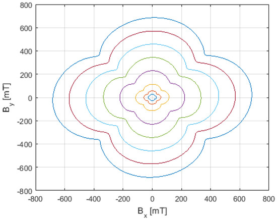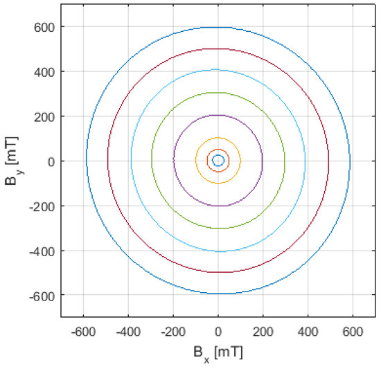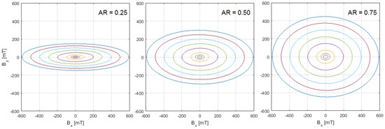 The first test case consisted of the simulation of the families of concentric elliptic loops for each one of the considered values of the aspect ratio. The measured trajectories of the magnetic induction, applied as input to the NS, are displayed in Figure 5. On the other hand, the measured and the simulated trajectories of the magnetic field vector on the Hx–Hy plane relative to the elliptic loops with AR = 0.25 are represented in Figure 6 for some values of the corresponding amplitude of Bx (major axis of the ellipse), covering the entire range examined. The same kind of magnetic field curves but relative to the other values of the aspect ratio are illustrated in Figure 7 and Figure 8.