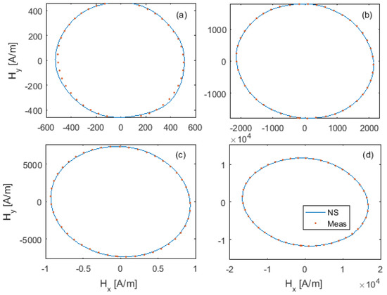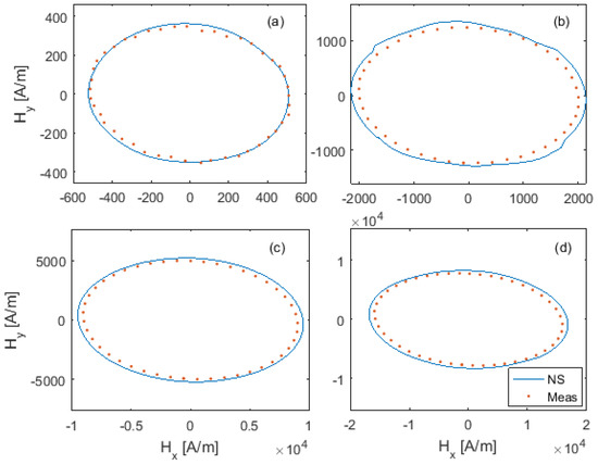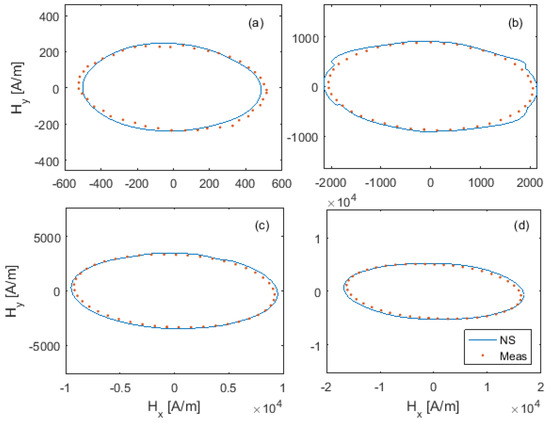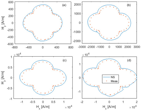 The accuracy of the identification stage was validated by the comparison of the computed trajectories of the H field with the measured ones. This comparison is illustrated in Figure 4 for some of the rotational loops of SET 1.