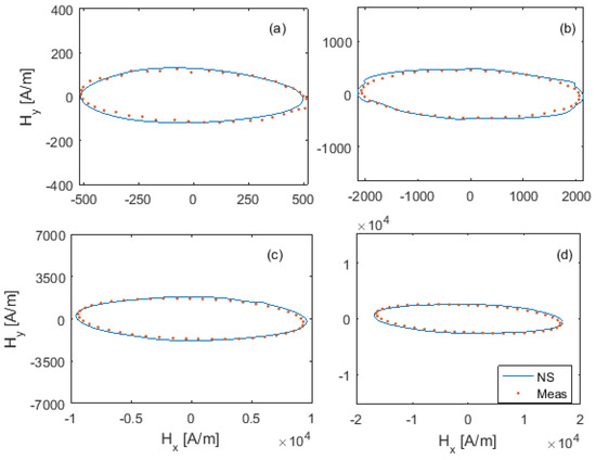 It has to be specified that purely scalar excitations cannot be thoroughly represented by the NS, which would always produce an output magnetic field collinear with the input magnetic induction, and this is not exactly true in practice. For this reason, other features of the purely scalar hysteresis processes, such as the remanence, the coercivity, and the energy losses, cannot be conveniently obtained by the NS alone. Nevertheless, it must be said that in practice purely scalar excitations very rarely occur, and that in most of the cases magnetic induction trajectories are elliptical, eventually with an aspect ratio with a small value. These kinds of processes present a level of energy loss that is very close to scalar ones and can be effectively simulated by the NS, as discussed in Section 4.1.