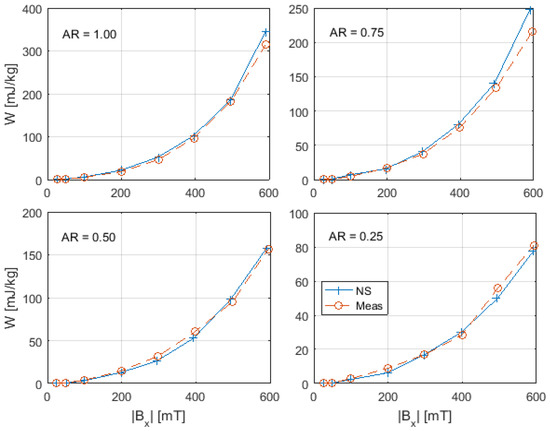Finally, it is interesting to point out that the relationship between the energy lost and the aspect ratio was almost linear if the fixed level of the magnetic induction was higher than 300 mT. Indeed, the progression of the measured energy lost at the induction of 600 mT, here indicated with , for AR = 0.25, 0.5, and 1 was 81.0 mJ/kg, 156.9 mJ/kg, and 315.2 mJ/kg, respectively. Similarly, the progression of the simulated energy lost at 600 mT, indicated similarly with for the same values of the aspect ratio, was 78.0 mJ/kg, 157.0 mJ/kg, and 344 mJ/kg, respectively. Similar values can be found if one considers other levels of Bx higher than 300 mT. For lower levels of induction, the behavior of the energy loss versus the aspect ratio was less regular, because the shape of the curves W(Bx) slightly changed with AR.