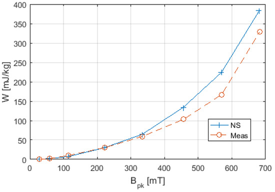 The energy losses predicted by the NS model were very close to the ones measured up to Bpk = 345 mT. Above that value the NS tended to overestimate the measured losses and the maximum percentage deviation found for Bpk = 575 mT was 22%.
