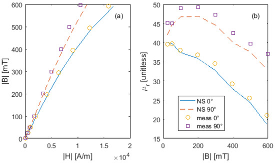 From the measured and the simulated data we first determined the first B–H magnetization curves along both the 0° and the 90° directions, connecting the vertices of the hysteresis loops along the x- and the y-axes, respectively. The first magnetization curves are shown in Figure 13a, where the slight anisotropy character of the material, already evidenced by the analysis of the rotational loops, was again confirmed. Indeed, the slope of the first magnetization curve measured along the y-axis (90°) was sensibly higher than the slope of the fist magnetization curve measured along the x-axis (0°). The data obtained by the NS simulations correctly predicted the first magnetization curve without any additional identification procedures.
