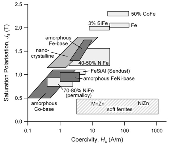 Comparison of the magnetic properties of soft magnetic materials (reprinted with the permission from [23], Elsevier, 2013).