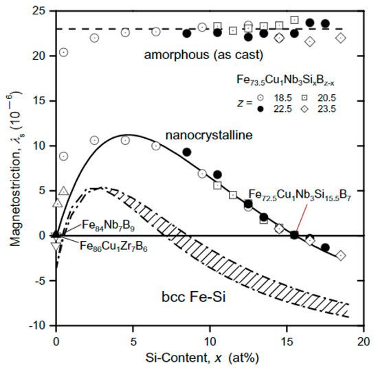 The saturation magnetostriction constant (λs) of Fe96−zCu1Nb3SixBz−x alloys as a function of Si content for the amorphous and nanocrystalline states (reprinted with the permission from [23], Elsevier, 2013).