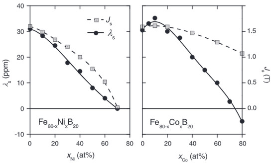 Saturation magnetisation Js (dashed lines) and saturation magnetostriction λs (full lines) of amorphous Fe-Ni-based and Fe-Co-based alloys with changing Ni and Co content, respectively (reprinted with the permission from [23], Elsevier, 2013).