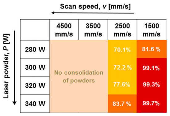 Relative density map of the selective laser melting (SLM)-processed Fe68.3C6.9 Si2.5B6.7P8.7Cr2.3Mo2.5Al2.1 specimens as a function of laser power and scan speed, the values of which increase in the directions of the arrows. Figure taken from and reprinted with the permission from [8], Elsevier, 2015 (Common Grading Scale (CGS) to The International System of Units (SI) conversion 1 emu/g = 1 Am2/kg and 1 Oe = 79.6 A/m).