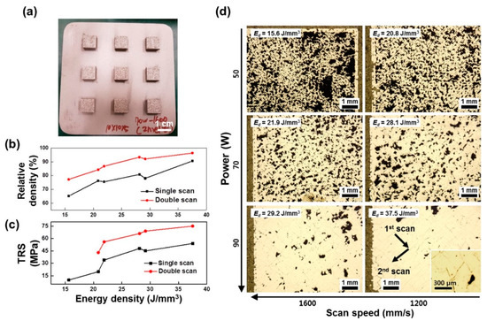 The graph of (a) macroscopic photograph of 3D-printed Fe73.7Si11B11C2Cr2.28 alloys, (b) relative density and (c) transverse rupture strength (TRS) versus laser energy density and (d) optic microscope images of double-scanned alloys (reprinted with the permission from [75], Elsevier, 2020).
