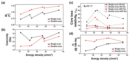 The graph of (a) magnetic saturation (Ms), (b) coercivity (in Oe), (c) core loss relativity and (d) relative permeability, µr, taken as at 100 Hz frequency (@ 100 Hz) versus laser power density for 3D-printed Fe73.7Si11B11C2Cr2.28 alloys (reprinted with the permission from [75], Elsevier, 2020).