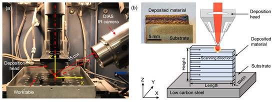 (a) The experimental setup and (b) the schematics of the laser-engineered net shaping (LENS) process (reprinted with the permission from [78], Elsevier, 2020).