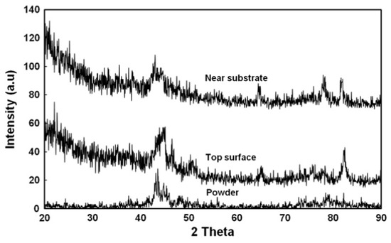 XRD patterns of the top surface (15 mm for substrate) and near substrate (0.8 mm from substrate) of LENS processed Fe-based BMGs compared to NSSHS7574 starting powder, illustrating that the amorphous alloys have a mixture of amorphous and crystalline phases (reprinted with the permission from [80], Elsevier, 2010).