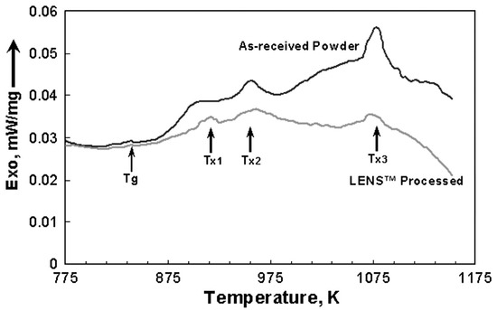 Differential scanning calorimetry (DSC) curves of the feedstock powder and the 3D-printed NSSHS7574 alloy, depicting three crystallisation peaks with three-stage crystallisation behaviour, reprinted with the permission from [80], Elsevier, 2010 (Tg is glass transition temperature and Tx1, Tx2 and Tx3 are crystallisation temperatures, showing that the material undergoes a three-stage crystallisation process upon heating).