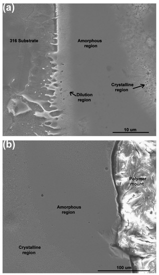 where dT/dt (K/s) is the cooling rate, R (mm/s) is the solidification velocity and G (K/mm) is the local thermal gradient [83]. Through experiments, it has been presented that R is in the order of the laser scanning speed (v) [84], which is 20 mm/s in the study by Balla and his team [74], and G is approximately 100 K/mm [79]. Hence, by using this study, the cooling rate in the melt zone calculated using Equation (3) is approximated to be 2000 K/s, which is more than enough to produce an amorphous NSSHS7574 alloy with a critical cooling rate of 610 K/s [85]. Still, in order to make better estimations of cooling rates, it is necessary to take into consideration the substrate or prior deposit temperature, temperature change in the melt zone, laser input and the thermal conductivity of substrate and deposited alloys. Despite the complicated physics of laser surface melting [86,87], improved approximation of cooling rates during laser surface melting can be achieved by using the Rosenthal solution for a mobile heat source (Equation (4), as presented by Steen [87].