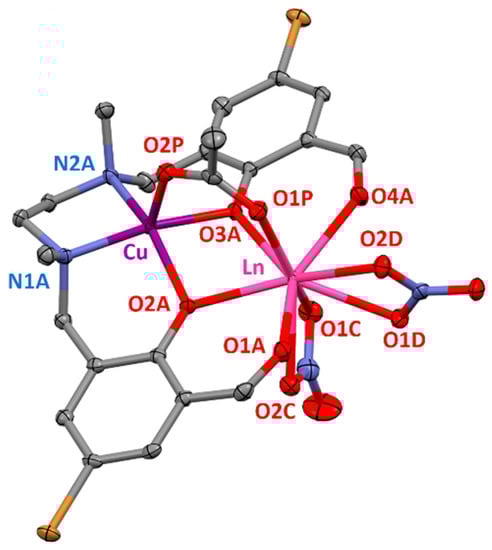 Perspective view of the molecular structure of 1–4. Crystallization solvent molecules and hydrogen atoms are omitted for the sake of clarity. Colour code: N = blue, O = red, C = grey, Br = brown, Cu = purple, Ln = pink.