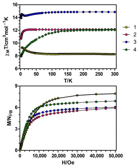 The temperature dependence of the magnetic susceptibility for the dinuclear CuIILnIII complexes were measured on polycrystalline samples in the 5–300 K (1) and 2–300 K (2–4) temperature ranges under an applied field of 0.1 T and is given in the form χMT in Figure 3.