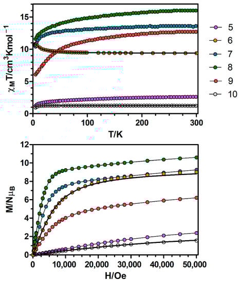 Top: Temperature dependence of the χMT product at 1000 Oe for complexes 5–10. Bottom: M versus H plots for complexes 5–10 at 2 K. Black solid lines show the best fits for complexes 6 and 10. The rest of the lines are a guide to the eye.