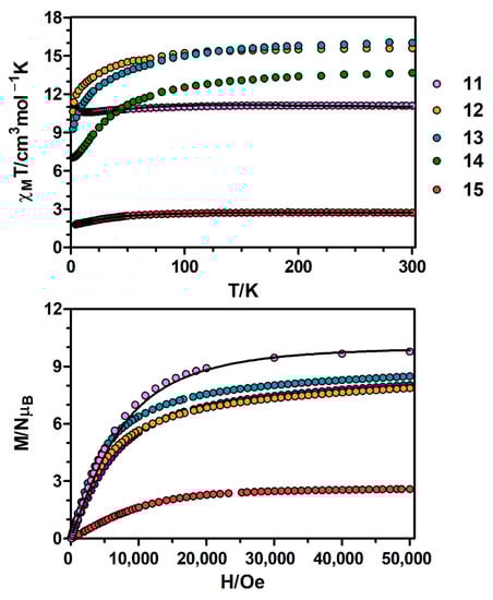 Top: Temperature dependence of the χMT product at 1000 Oe for complexes 11–15. Bottom: M versus H plots for complexes 11–15 at 2 K. Black solid lines show the best fits for complexes 11 and 15.