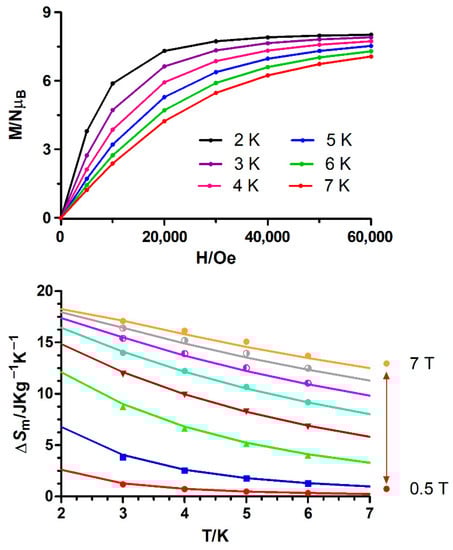 The fitting of the experimental isothermal magnetization data (Figure 7 and Figure S12) to the Maxwell relation (Equation (7), Bi and Bf are the initial and final applied magnetic fields, respectively) leads to maximum −ΔSm values that appear in Table 1.
