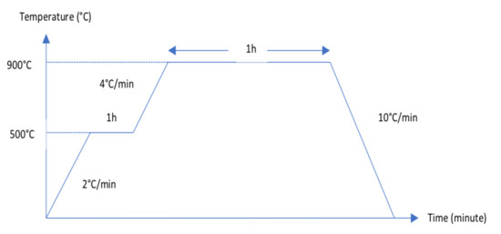 Next, the curing process was continued, using different curing temperatures. There were four selected temperatures, namely: Room temperature (RT), 40, 60, and 80 °C, for 14 days. The samples were demoulded afterwards. The samples were divided into two sets, “as-cured” and “sintered”. The as-cured samples were sintered using a heating profile, as shown in Figure 1. Step 1 was sintered at a lower temperature (T1): 500 °C with a heating rate of 2 °C/min. A higher temperature (T2) was applied in step 2: 900 °C with a heating rate of 4 °C/min. The “soaking” time was set to 1 h for each step. The cooling rate was 10 °C/min. The kaolin-GGBS geopolymer was sintered using a bench-top muffle furnace. The purpose of using two-steps of the sintering process in this work was to reduce the major cracking, since the as-cured kaolin-GGBS geopolymer was directly sintered without the powder pressing method.
