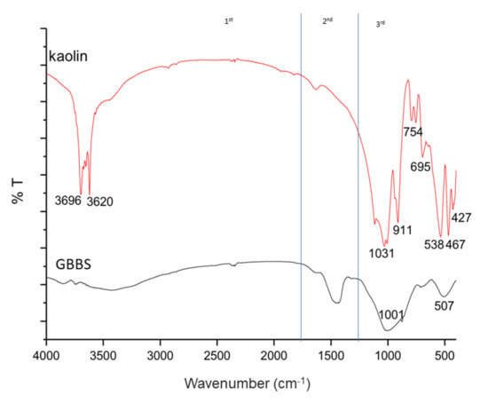 Fourier transform infrared spectroscopy (FTIR) spectrum of kaolin and GGBS.